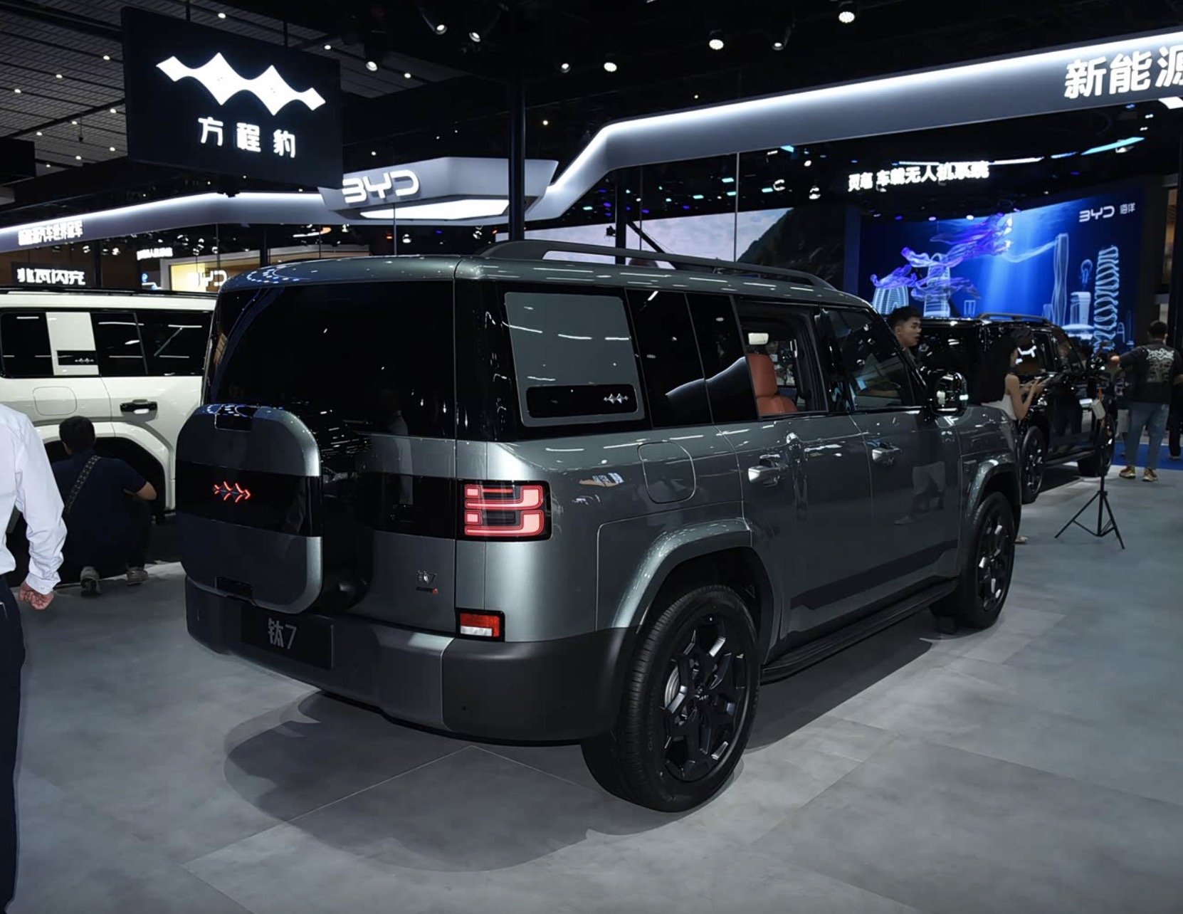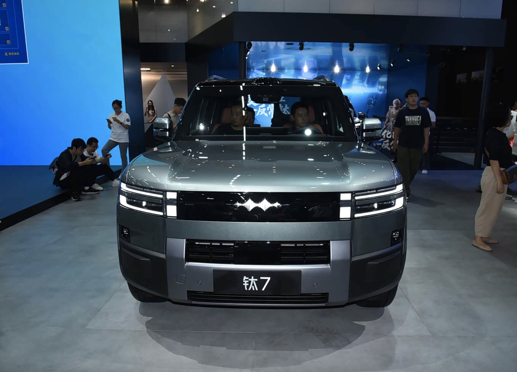 关于新车的外观,想必大家都非常熟悉了,虽然还未上市,但是网络上也是遍布该车的信息,这里我们再来回顾一下吧。外观设计上,方程豹钛7采用“星际方舟 设计语言,整体呈现出硬派的方盒子造型,线条硬朗且流畅,极具辨识度。前脸两侧双层布局的 L 形灯带与方形头灯组相得益彰,灯带内侧的方形模块同样能够点亮,进一步提升了前脸的独特性。车身侧面,笔直的腰线贯穿车身,搭配车身同色轮眉、方形外后视镜以及固定式侧踏,展现出沉稳大气的风格。车尾部分,双层布局的尾灯组十分醒目,外挂式储物箱设计独特,侧开式尾门方便实用。