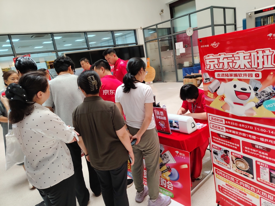 智能家电阵列错落展示、便民服务专区人头攒动、家电顾问穿梭讲解……8月25日至27日,塘桥街道联合京东电器城市旗舰店浦建路店,在陆家嘴软件园1号楼启动专场内购会。这场政企园协同打造的“楼门口消费服务”,让园区企业员工足不出职场即可体验到生活节的智能生活场景、畅享专属优惠,为浦东“一刻钟便民生活圈”建设再添生动实践。