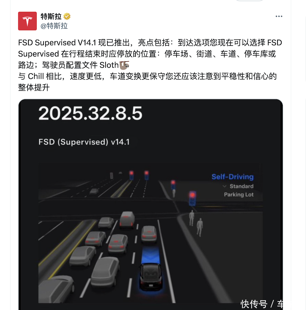 除了发布新车外,特斯拉也在当地时间周二(10月7日)宣布,已推出其最新版本的“完全自动驾驶”系统——FSD V14.1。