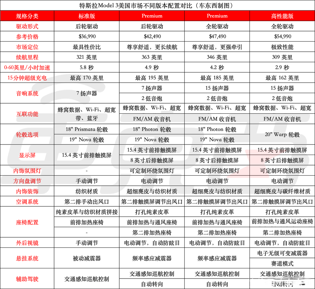 与Model Y标准版车型一同推出的还有Model 3标准版,主要减配在动力性能、悬挂配置、音响、后排屏幕、座椅等方面。