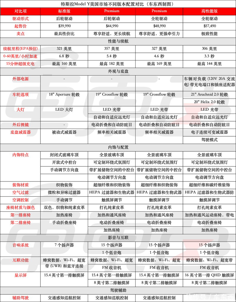 动力性能方面,Model Y标准版0-60英里/小时加速时间为6.8秒,Premium后轮驱动版仅需要5.4秒,Premium全轮驱动版则需要4.6秒。