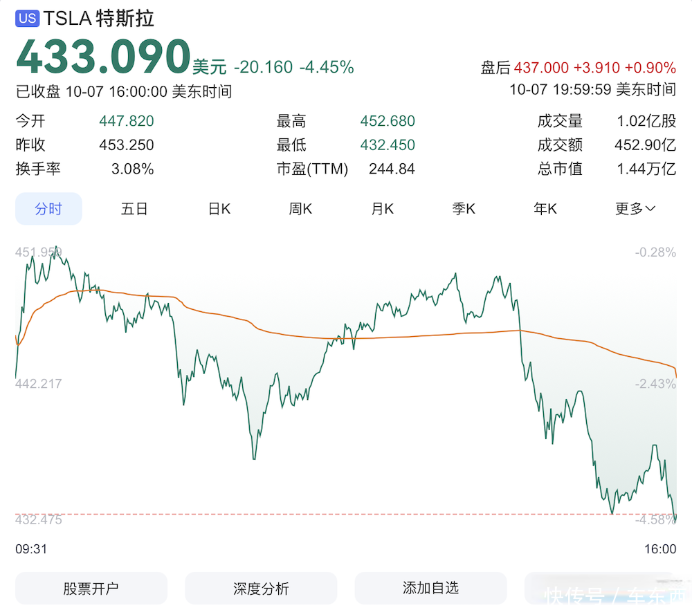 消息发布后,特斯拉美股股价跌4.45%,市值蒸发约670亿美元(约合人民币4770亿元)。